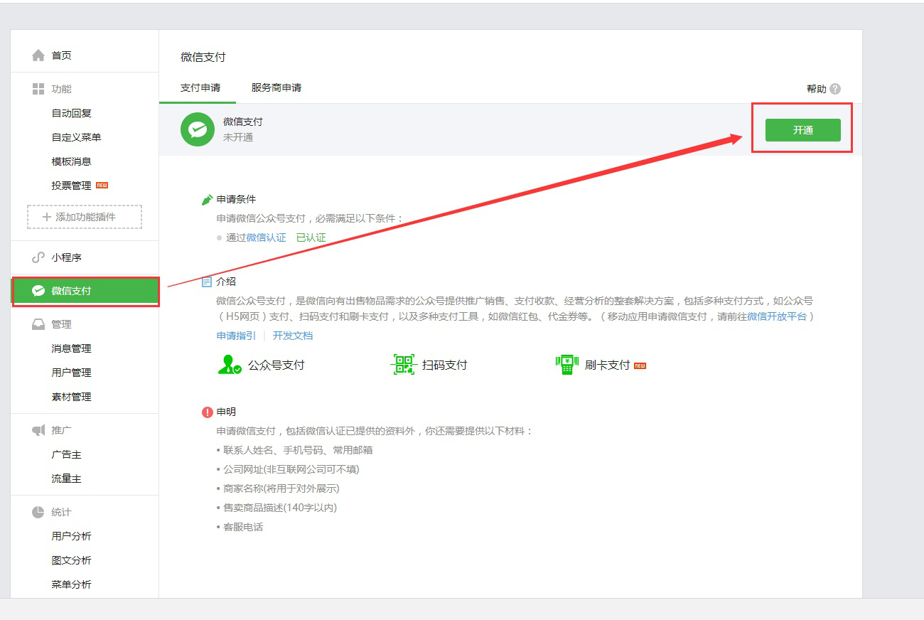 (1)登录你的微信公众号,点击“微信支付”--点击“开通”