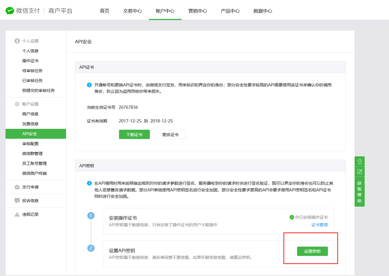 设置key:登录商户平台,在设置key前,按照页面提示,安装证书,安装成功后设置秘钥,手动设置32位长度的任意数字和字母