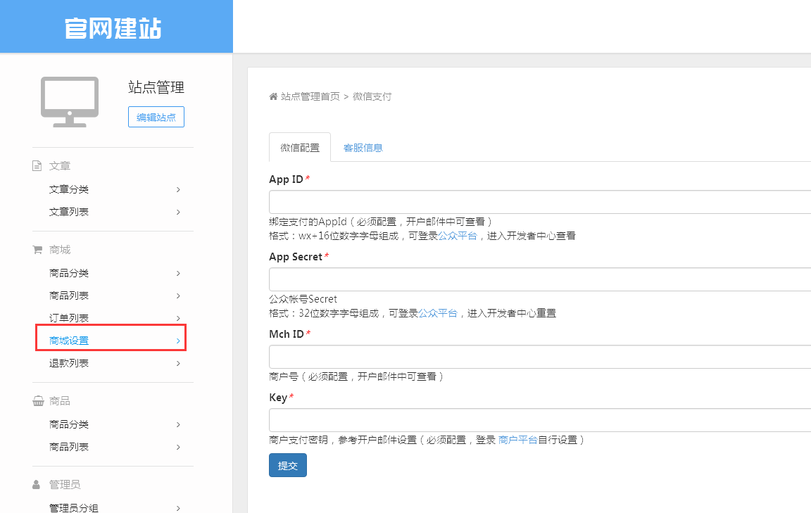 7、最后,将AppID、AppSecret、商户号、Key,AppID和AppSecret填入网站管理后台保存即可。