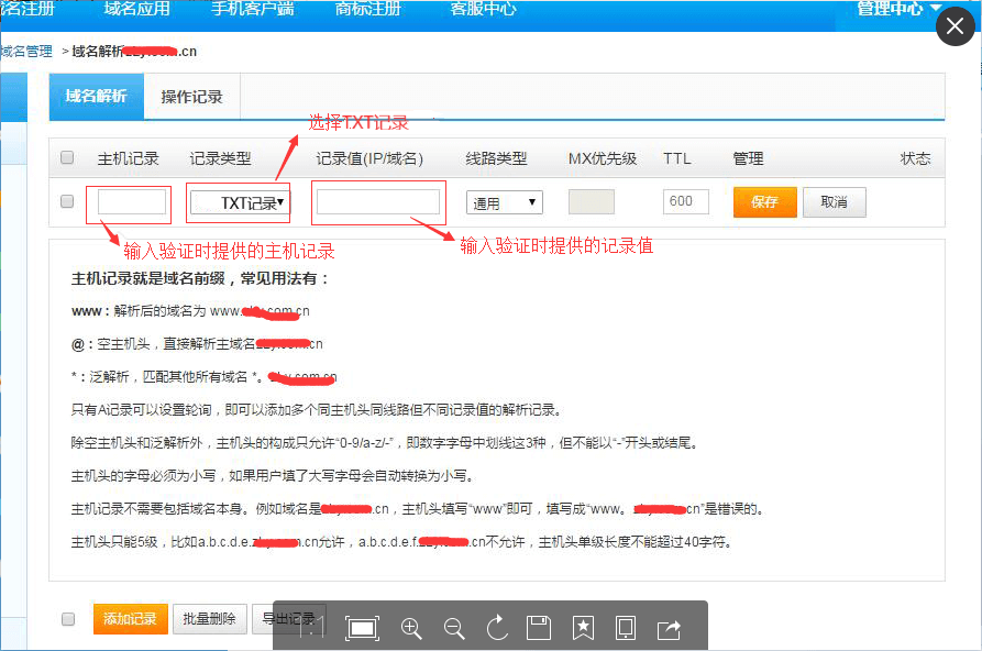阿里云账户下的域名解析方法:找到需要域名,如图,将记录类型选择为TXT,在主机记录中输入ssl验证时获取到的一长串主机记录,包括网址信息,在记录值中输入ssl验证时获取的一串记录值。