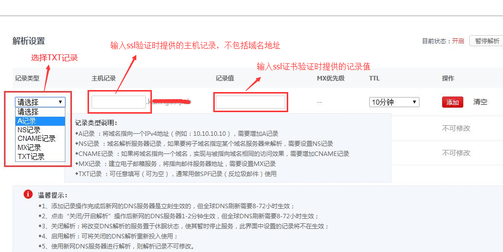 易名账户下的域名解析方法:如图,在主机记录中输入ssl验证时获取到的一长串主机记录,包括网址信息,将记录类型选择为TXT,在记录值(IP/域名)中输入ssl验证时获取的一串记录值。