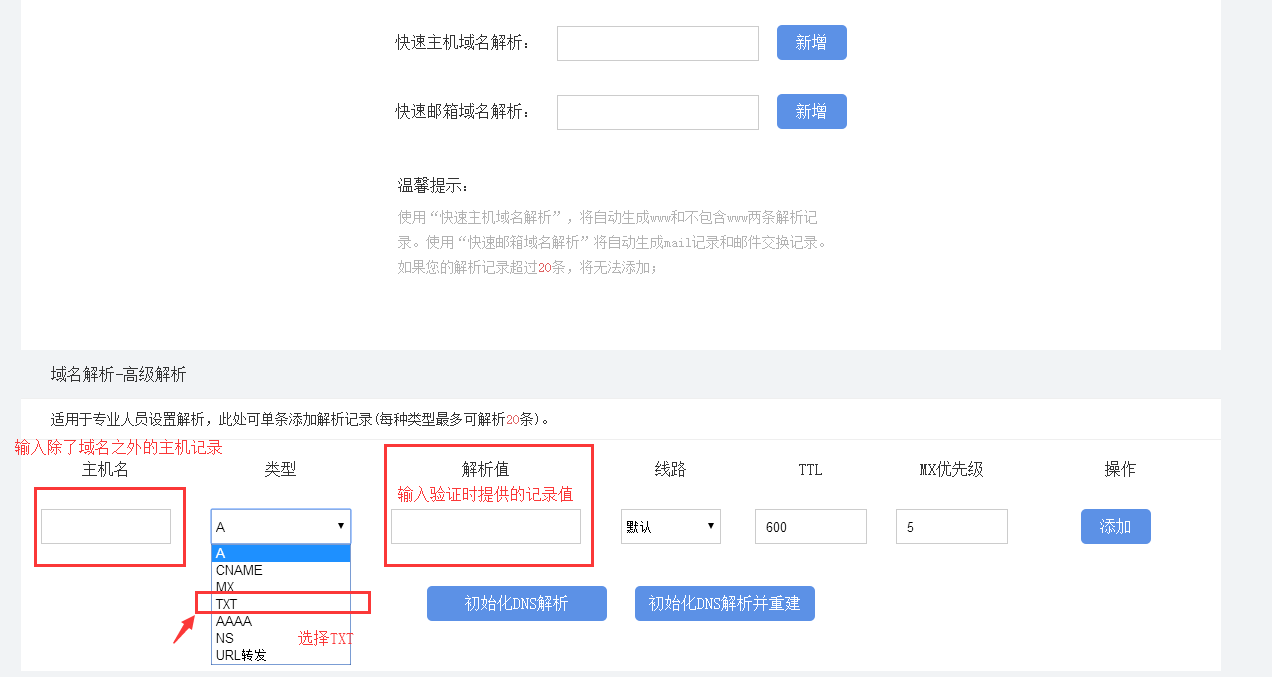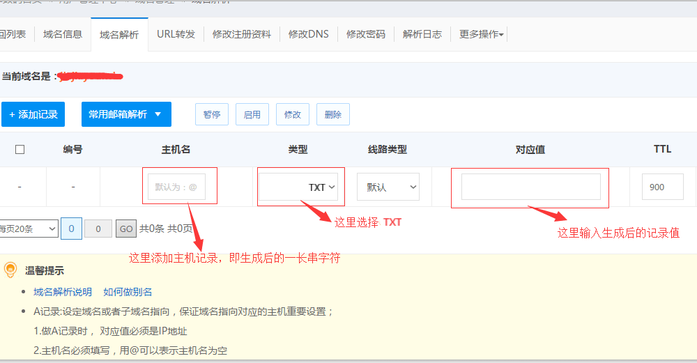 域名解析方法:找到要解析的域名,进入域名管理中心-域名解析-域名高级解析,按图所示,在主机记录中输入ssl验证时获取到的一长串主机记录,包括网址信息,将记录类型选择为TXT,在记录值(IP/域名)中输入ssl验证时获取的一串记录值。