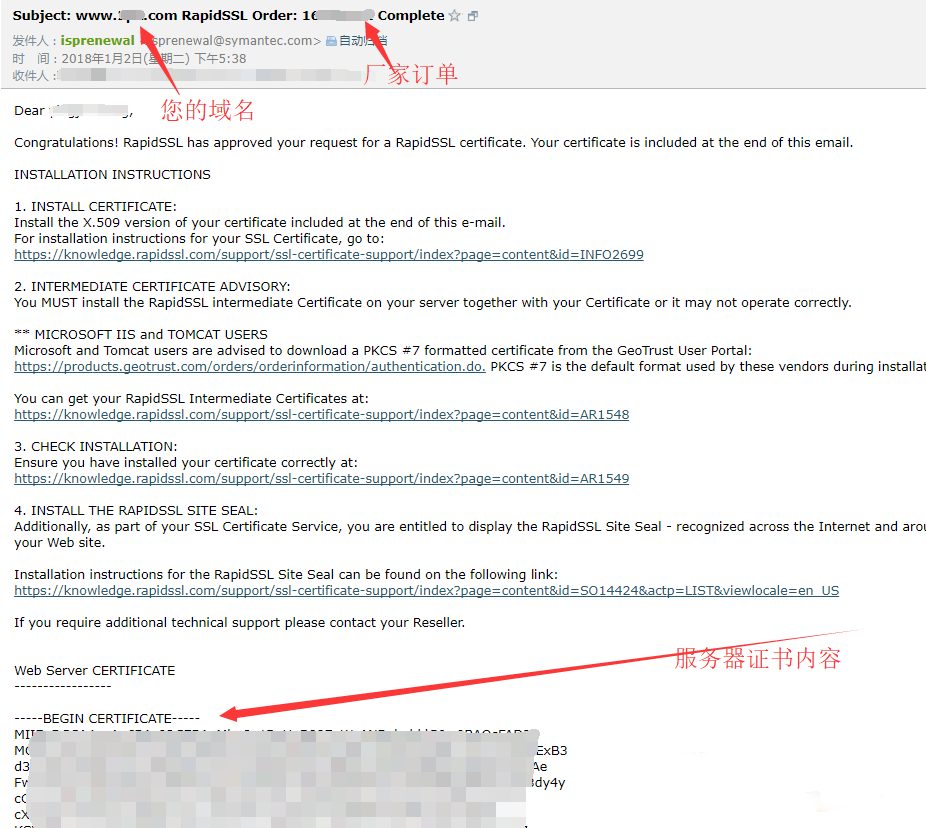在证书审核通过之后,最后厂商会将完整的服务器证书邮件发送至订单登记的技术人员邮箱(一般是域名whois邮箱)地址中,请确保该邮箱地址可以正常接收邮件。邮件主题为Order:XXXX Complete关键词,证书位置在邮件底部begin至end的一串代码,请仔细查看下您的域名是否正确(如域名错误,请及时联系我们的客服),如下图