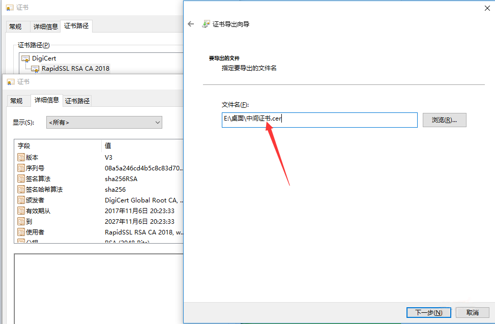 2.在证书路径中,鼠标点击中间证书(这里展示的是RapidSSL RSA CA 2018)-如图3,然后点击查看证书->详细信息->复制到文件->下一步-->选择Base64编码--如图4-->下一步-->浏览选择保存文件的路径并命名文件名保存--如图5。