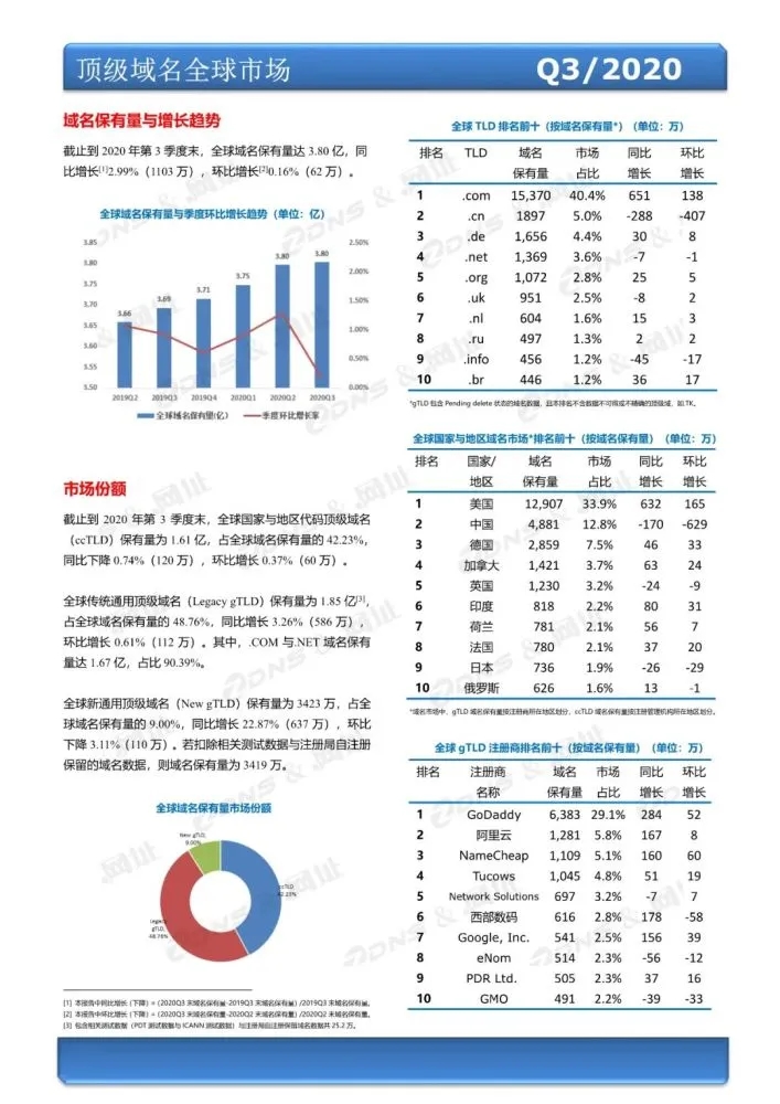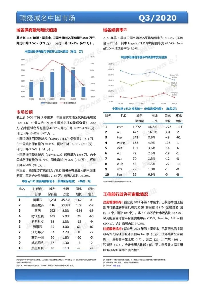 1、截止到2020年第3季度末,中国市场域名保有量[4]4881万[5],同比下降3.36%(170万),环比下降11.41%(629万)。