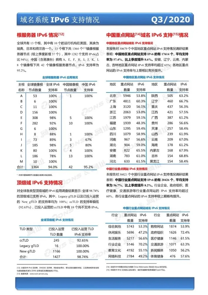 2、 中国行业重点网站支持IPv6的有20426个,平均支持率为56.7%,比上季度提升8.2%。行业企业、政府组织、医疗健康、交通旅游等行业重点网站的IPv6支持率均超过60%,各行业重点网站的IPv6支持率较上期略有提升。