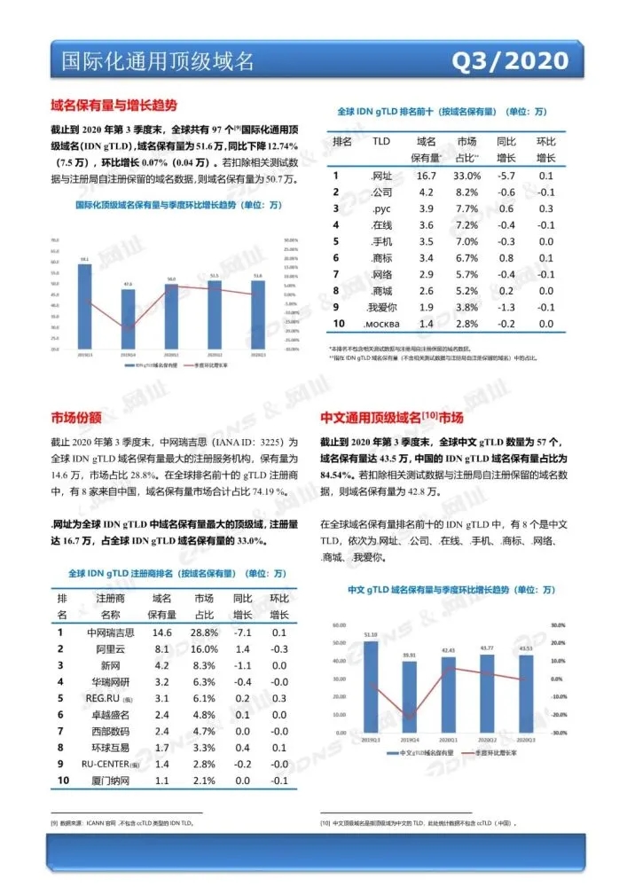 1、 截止2020年第3季度末,中网瑞吉思(IANAID:3225)为全球IDNgTLD域名保有量最大的注册服务机构,保有量为14.6万,市场占比28.8%。