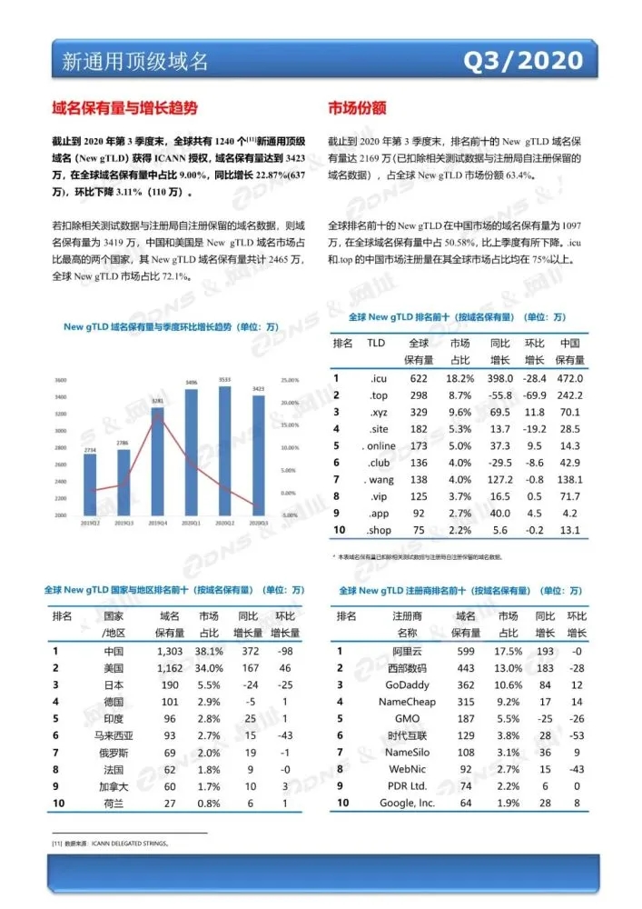 1、 截止到2020年第3季度末,全球新通用顶级域域名保有量达到3423万,在全球域名保有量中占比9.00%,同比增长22.87%(637万),环比下降3.11%(110万)。