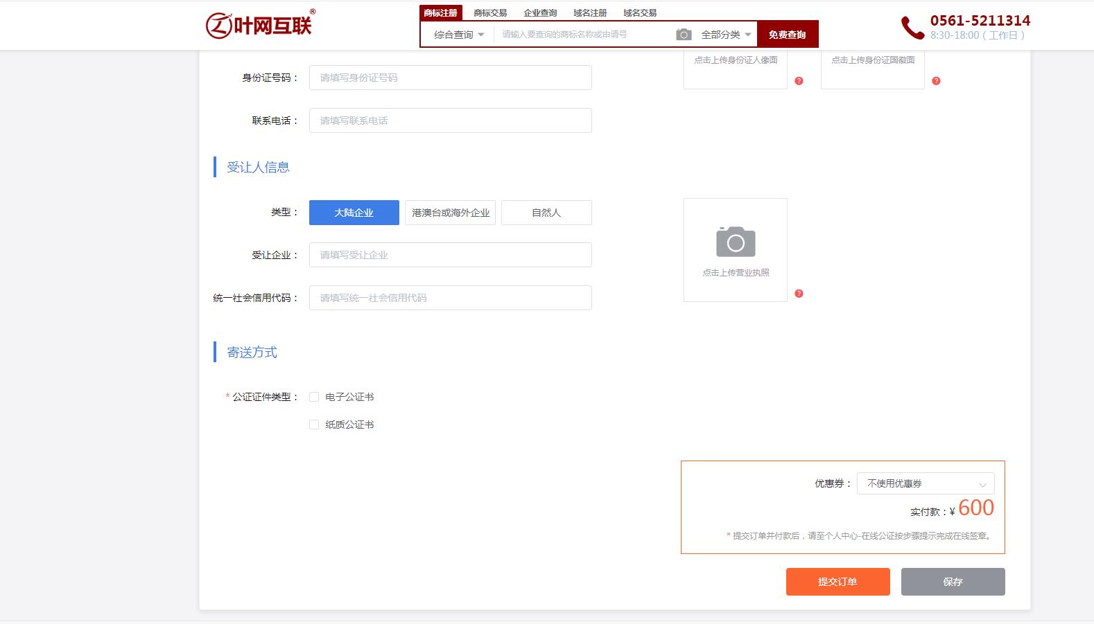 填写完成后,确认信息无误后,点击提交订单即可直接付款提交;点击保存可保存订单,在控制台-商标·知产-商标交易公证处可进入编辑页面再次修改。