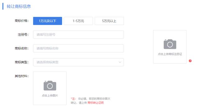 1.填写转让的商标信息。选择商标价格,填写商标注册号,注册号填写后系统会自动获取该商标的信息,如系统无法获取请手动补全该商标信息。