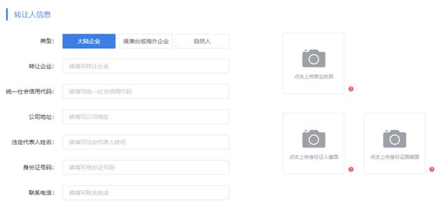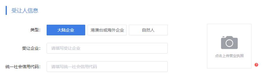 3.填写商标受让人信息,根据商标受让方的情况据实填写以下信息;受让人为企业的需要上传营业执照,为自然人的需要上传身份证正反面照。
