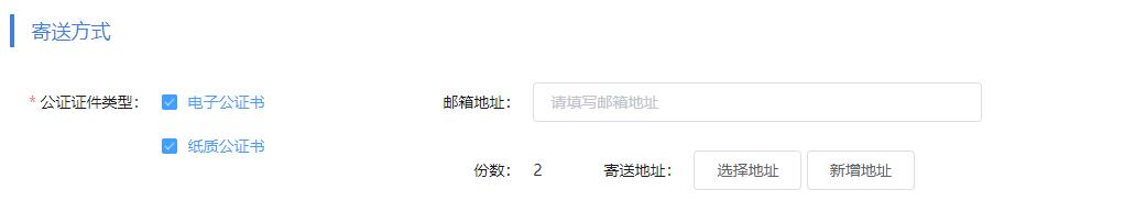 5.选择证明文件类型,用户可选择电子版公证书或纸质版公证书,电子版公证书将直接发送至用户填写的邮箱;纸质版公证书默认快递2份