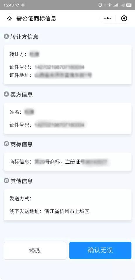 2.进入在线公证小程序后,先核对公证的基础商标信息,确认无误后点击按钮进入下一步;